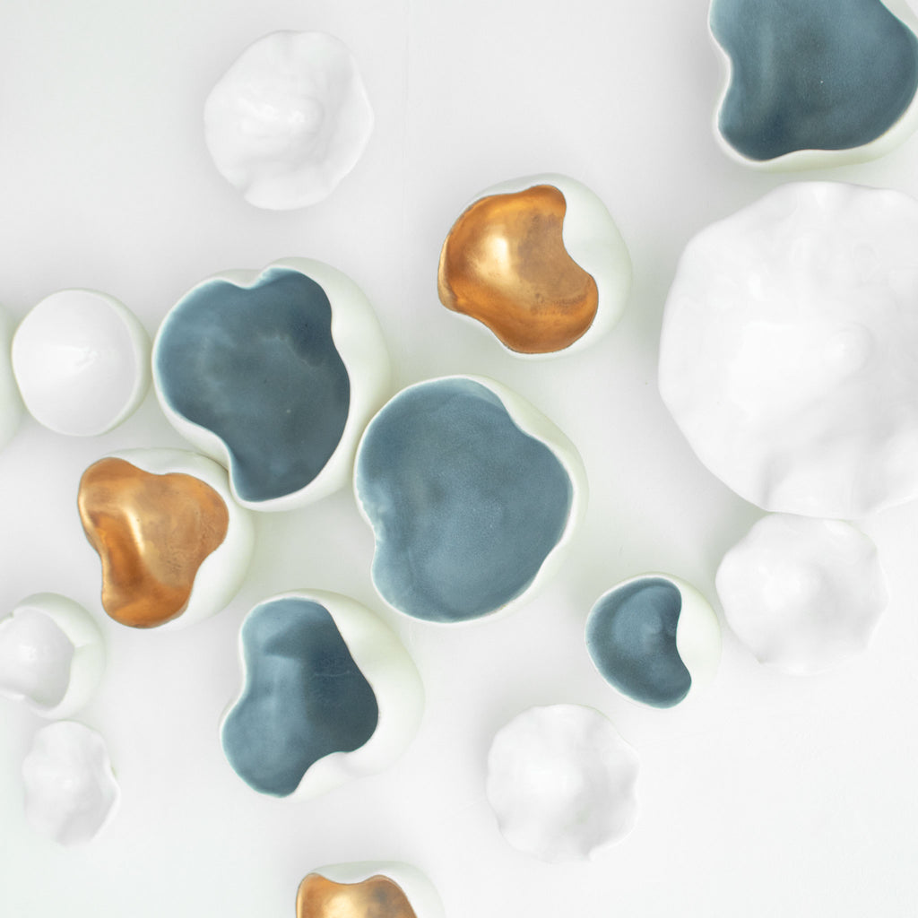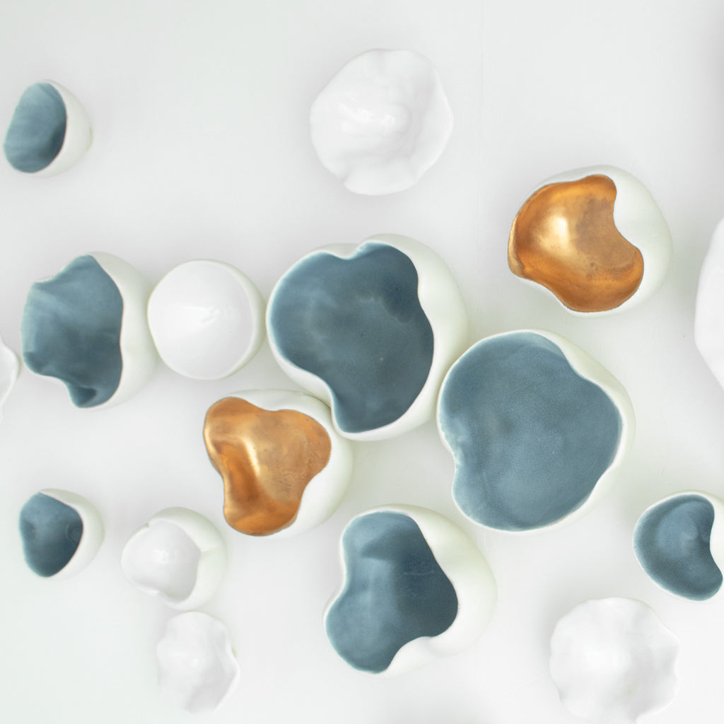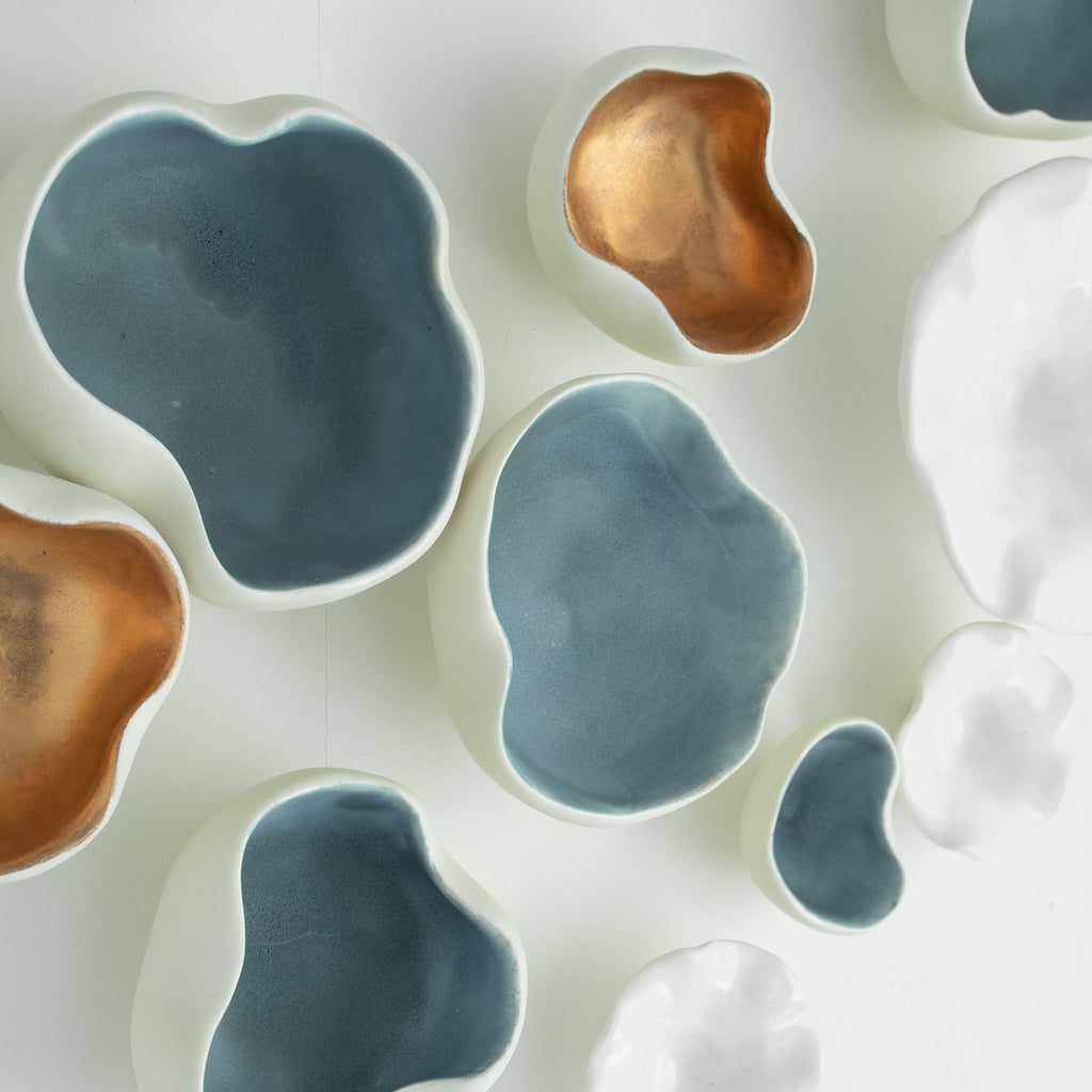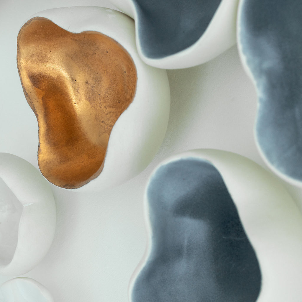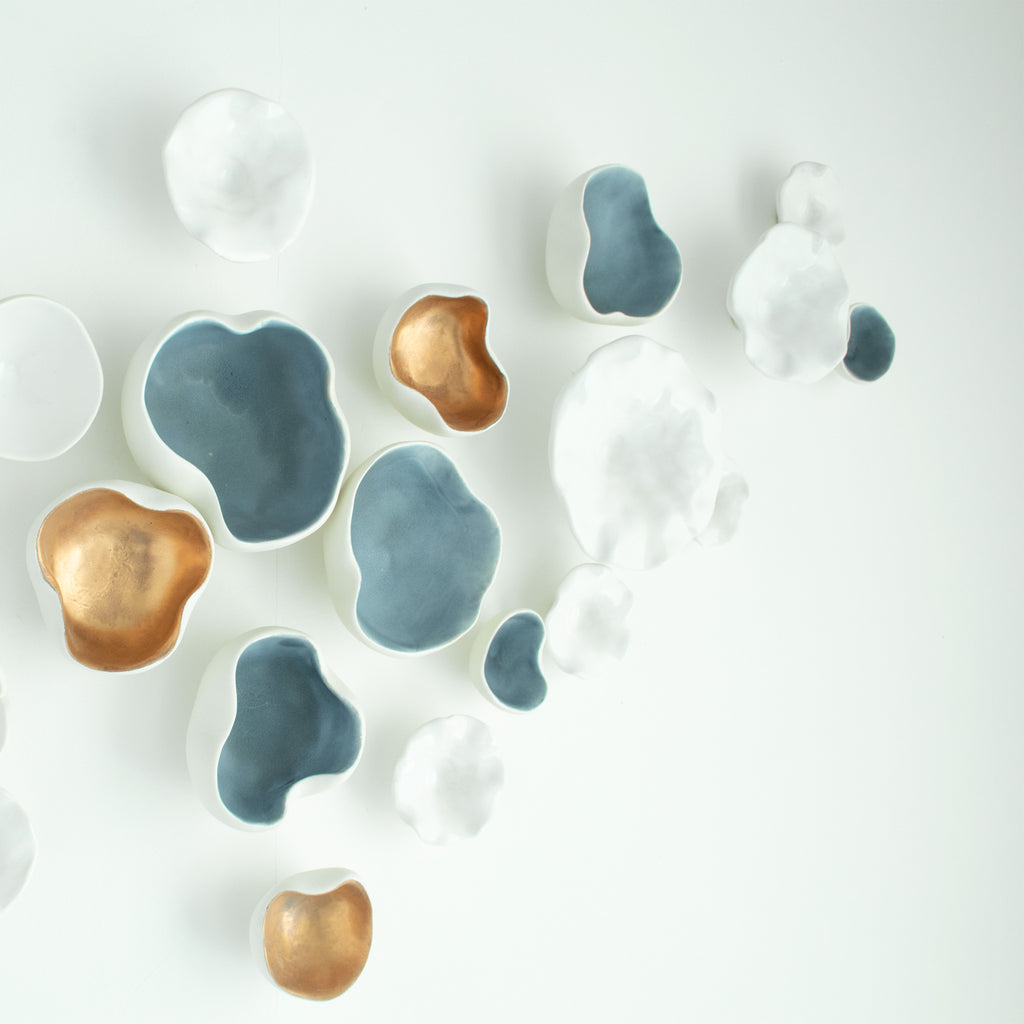 Glacial Drift is a handcrafted ceramic wall piece made of 12 sculptural forms in soft white, cool slate blue, and warm bronze. Inspired by slow-moving ice, shifting coastlines, and natural erosion, this piece captures a quiet sense of movement and balance. Each ceramic shape ranges from about 1.5 to 5 inches. The forms are designed to be mounted individually, giving you freedom to arrange them as a cohesive whole or a more open layout. Together, they span approximately 38 x 21 inches. The matte and metallic surfaces reflect light in subtle ways throughout the day, bringing depth without overwhelming the space. Every element is handmade, so each set has slight variations in tone and texture—making your piece truly one of a kind.