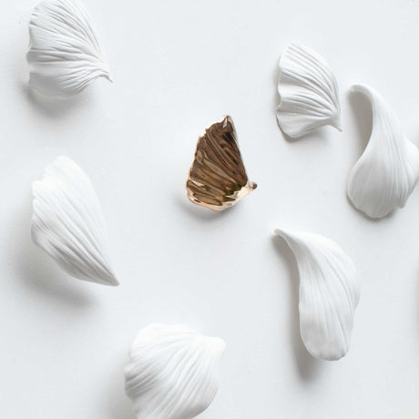 Ginkgo is a porcelain wall sculpture installation composed of ten hand-formed porcelain petals inspired by the delicate form of the ginkgo leaf.