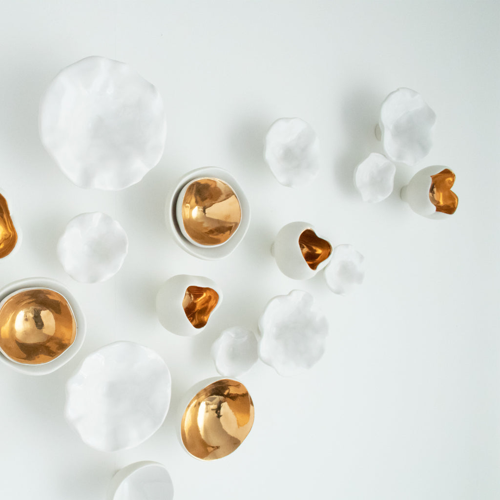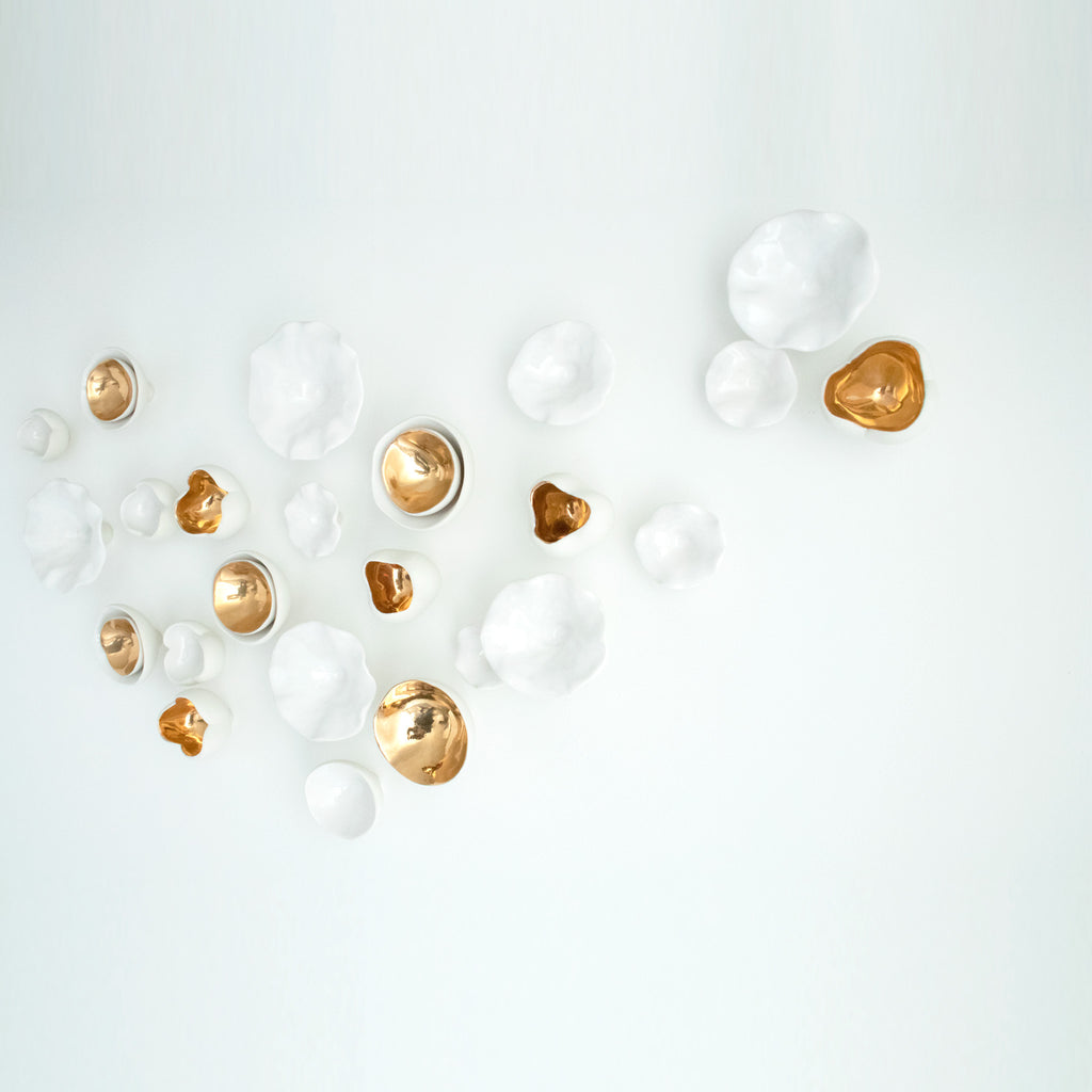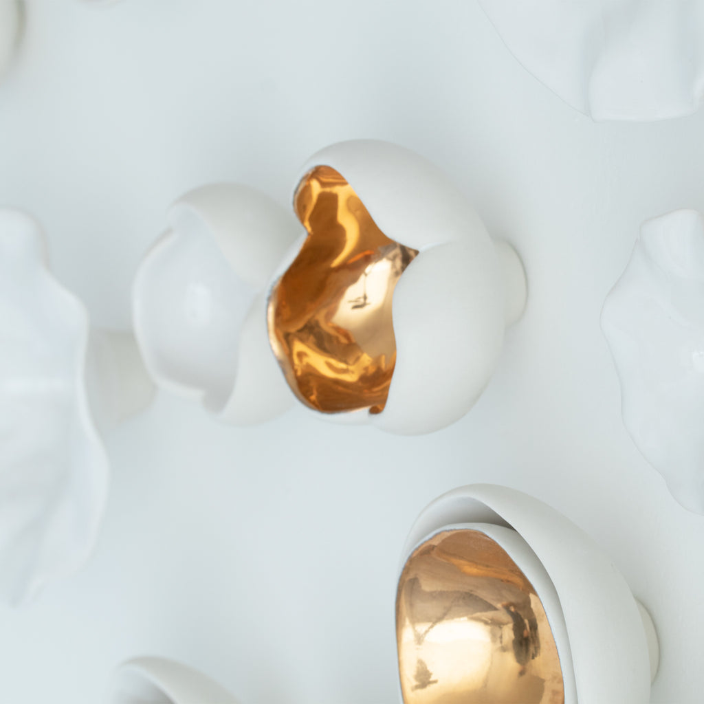 « Premier Rayon de Printemps » est une sculpture en porcelaine sur mesure célébrant la beauté du printemps. Elle comprend 24 pièces en céramique faites à la main, chacune inspirée par les fleurs en éclosion et la nouvelle croissance. Les sculptures varient en taille de 3,8 cm à 12,7 cm, 10 d'entre elles étant finies en or 24 carats pour une touche de chaleur et d'élégance.