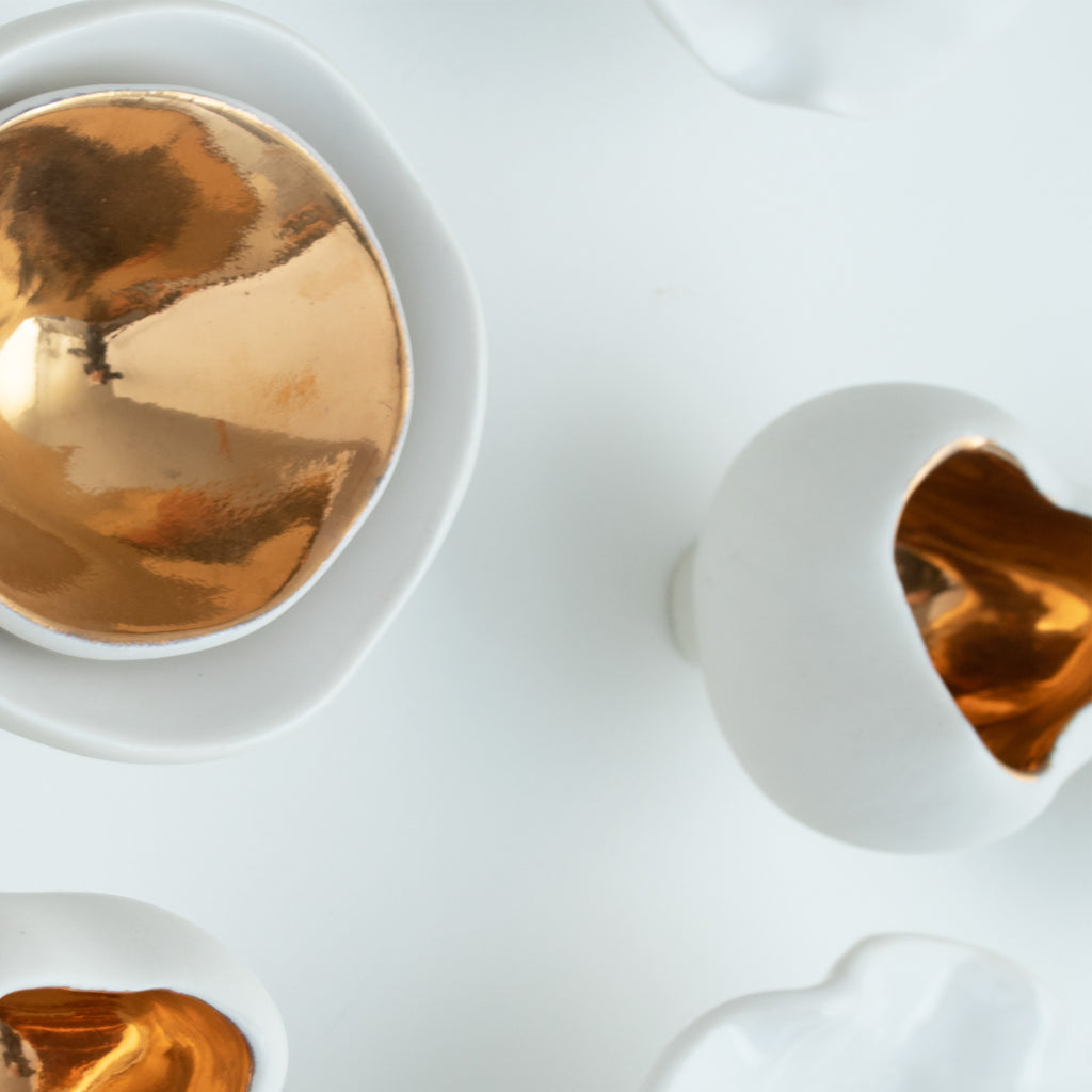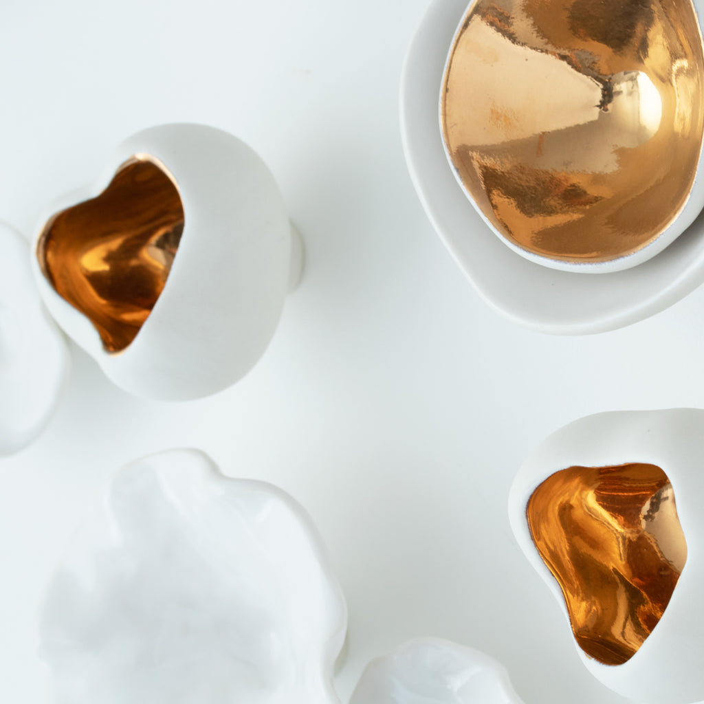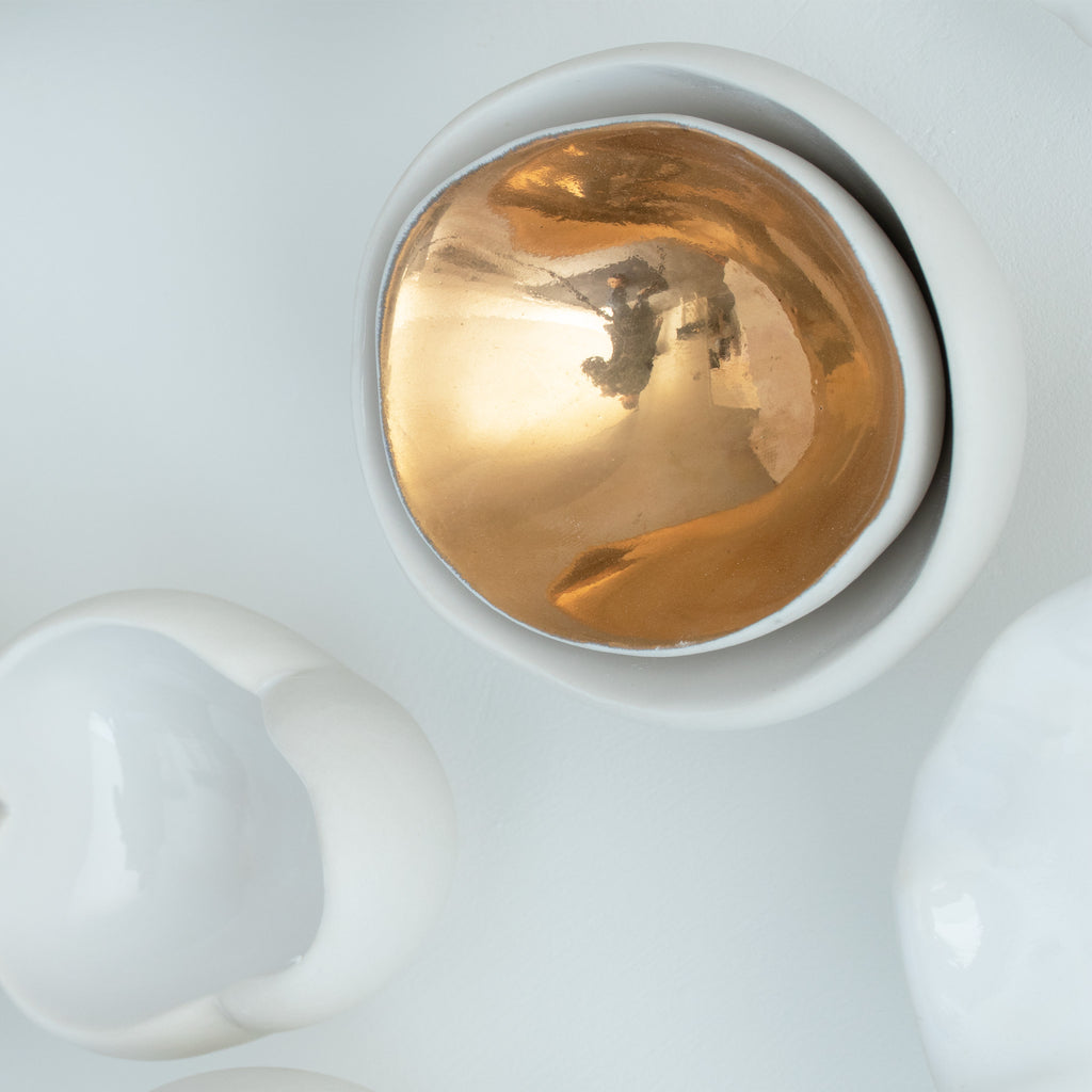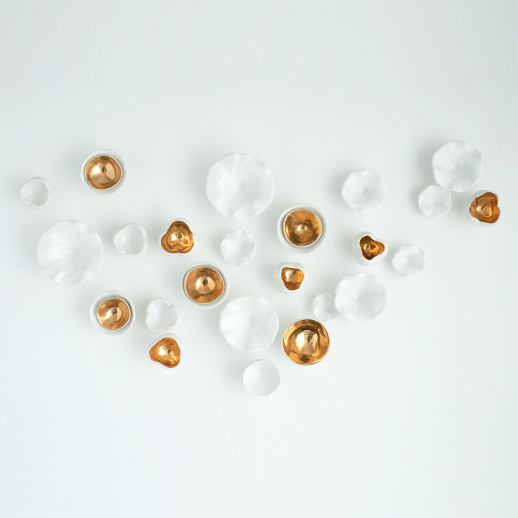 « Premier Rayon de Printemps » est une sculpture en porcelaine sur mesure célébrant la beauté du printemps. Elle comprend 24 pièces en céramique faites à la main, chacune inspirée par les fleurs en éclosion et la nouvelle croissance. Les sculptures varient en taille de 3,8 cm à 12,7 cm, 10 d'entre elles étant finies en or 24 carats pour une touche de chaleur et d'élégance.