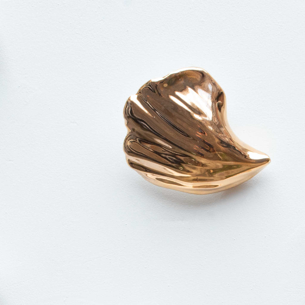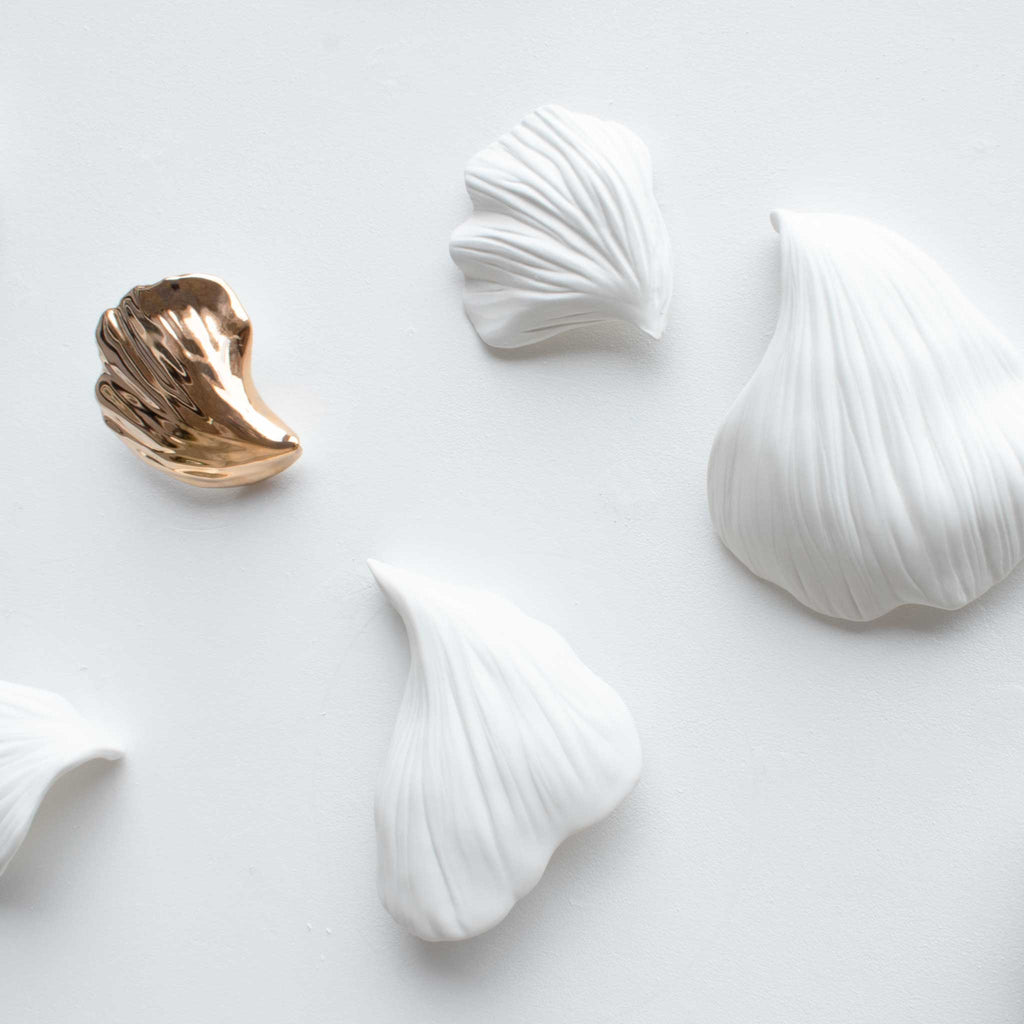 The Ceramic wall art installation features 10 hand-sculpted porcelain ginkgo petals made from translucent porcelain. The pieces are unglazed, showcasing a satin matte white finish, with one petal accented by 24 karat gold lustre. Each petal varies in diameter from 3 to 8 inches. Each of these unique porcelain artworks is made to order, ensuring that you receive a truly one-of-a-kind piece tailored to your preferences.